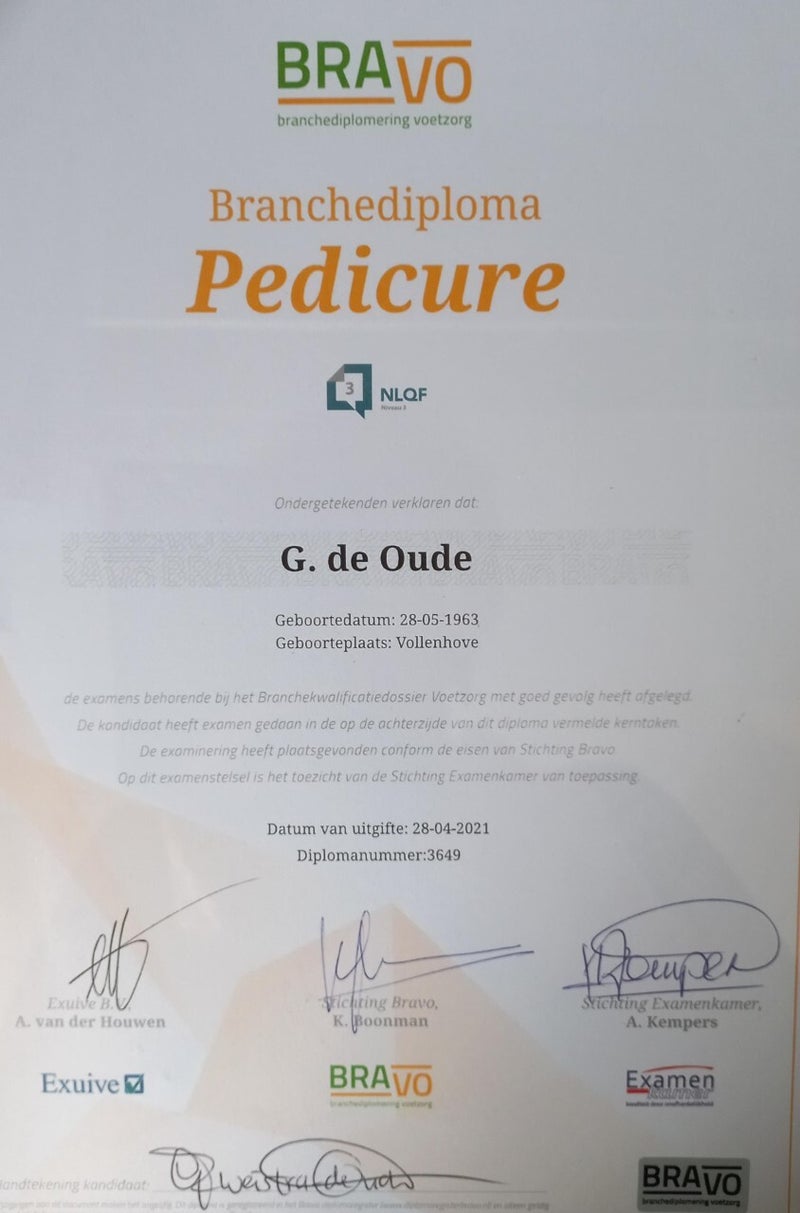 De Nederlandse branchevereniging voor pedicures heet ProVoet. Alle ProVoetleden zijn verplicht een vakdiploma te halen dat de branche erkent. Hierdoor weet u zeker dat uw voeten door een vakkundige pedicure worden behandeld. Pedicure Gesina te Vollenhove is een pedicure met opgeleide handen voor uw voeten!